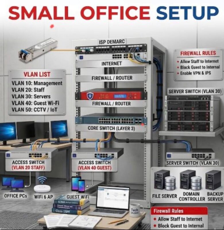Bạn đang setup mạng cho văn phòng nhưng sợ “râu ông nọ chắp cằm bà kia” hoặc lo ngại vấn đề bảo mật? Đây là mô hình chuẩn chỉnh giúp hệ thống vận hành trơn tru và an toàn tuyệt đối. Lớp 1: Cửa ngõ Internet (Internet Entry Point)• Firewall / Router: Đây là “người […]