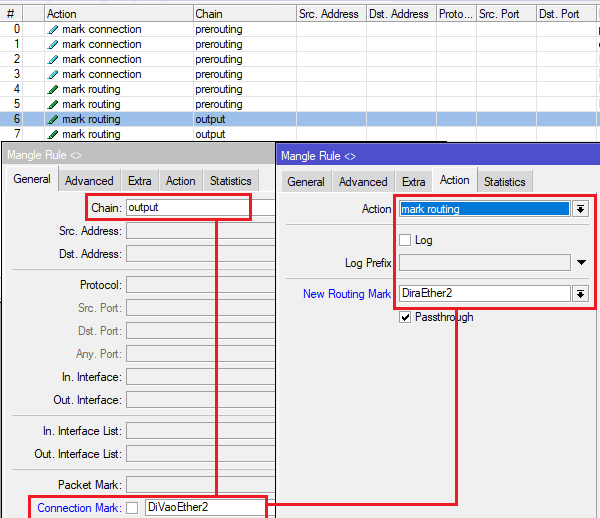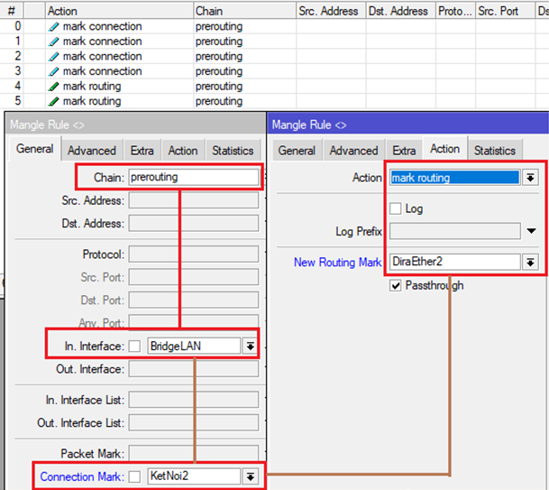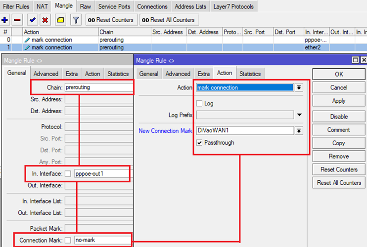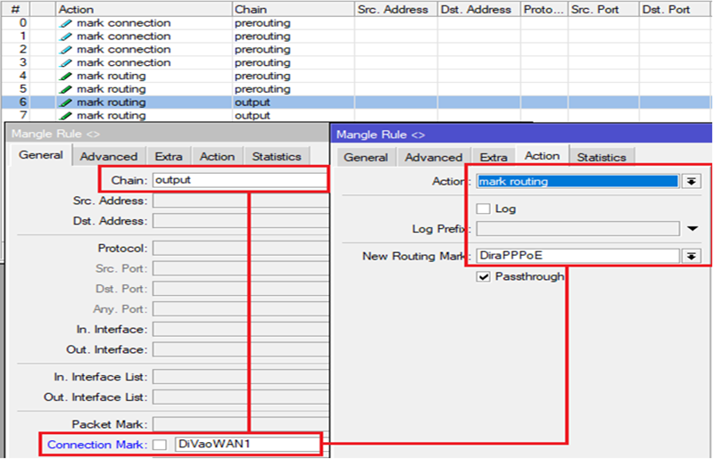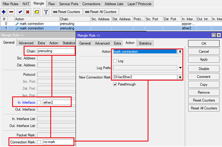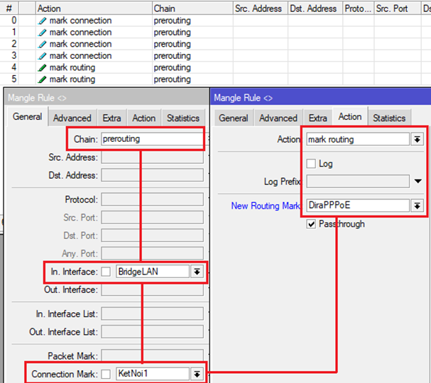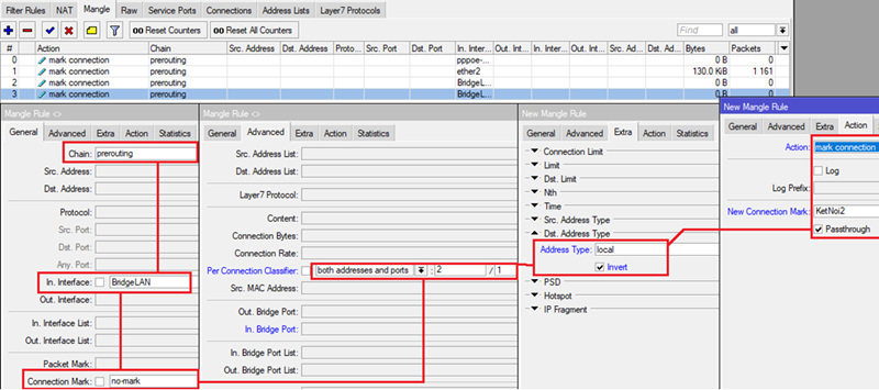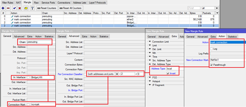 Tại Menu chọn IP-> Firewall và thẻ Mangle, đánh dấu toàn bộ các kết nối từ ngoài Internet vào Router MikroTik