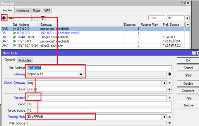 Bước 3: Đặt đường Internet kết nối qua cổng Ether1 là Distance=1 ( Giá trị distance nhỏ hơn thì đường Internet đó sẽ là đường chính)