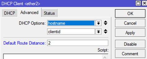 Bước 4: Đặt đường Internet kết nối qua cổng Ether2 là Distance=2